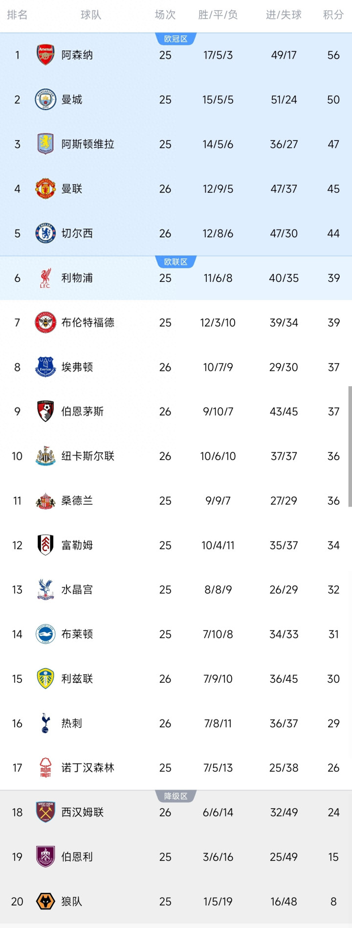 本轮事后,英超积分榜的争四、保级面貌都出现了新的变化,阿森纳依旧占据榜首位置,曼城、阿斯顿维拉紧随自后,曼联45分守住第四,切尔西44位列第五,利物浦39分暂居第六,热刺29分则深陷积分榜卑劣,保级区的争夺也愈发热烈。